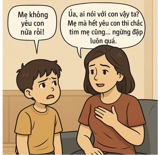 “Ủa, ai nói với con vậy ta? Mẹ mà hết yêu con thì chắc tim mẹ cũng… ngừng đập luôn quá. Mẹ không làm theo ý con không có nghĩa là mẹ không thương. Có khi thương mới phải nói ‘không’ đó con.