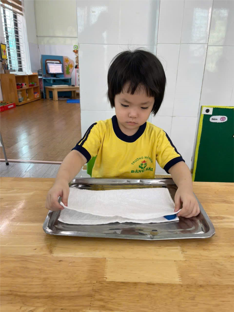Kỹ năng gấp khăn cũng là 1 trong những hoạt động giúp trẻ tập trung chú ý và định hướng