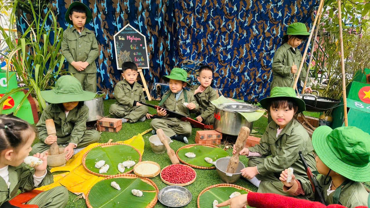 Đặc biệt, hoạt động trải nghiệm “Bữa cơm hành quân” giúp các bé hiểu hơn về cuộc sống giản dị của các chú bộ đội, từ đó thêm yêu quý và biết ơn những người lính đang ngày đêm bảo vệ Tổ quốc.