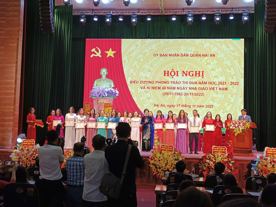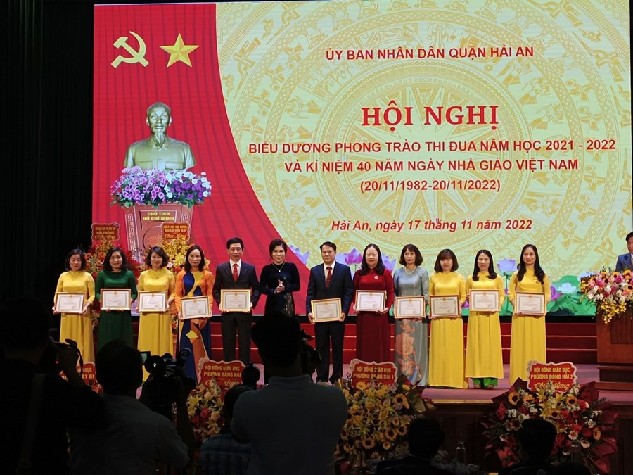 Về dự Hội nghị biểu dương phong trào thi đua năm học 2021 – 2022 và kỉ niệm 40 năm ngày Nhà giáo Việt Nam (20/11/1982 – 20/11/2018 ) có các đồng chí lãnh đạo HĐND, UBND quận Hải An, các đồng chí BGH, CTCĐ, các thầy cô giáo và các em học sinh được biểu dương trong