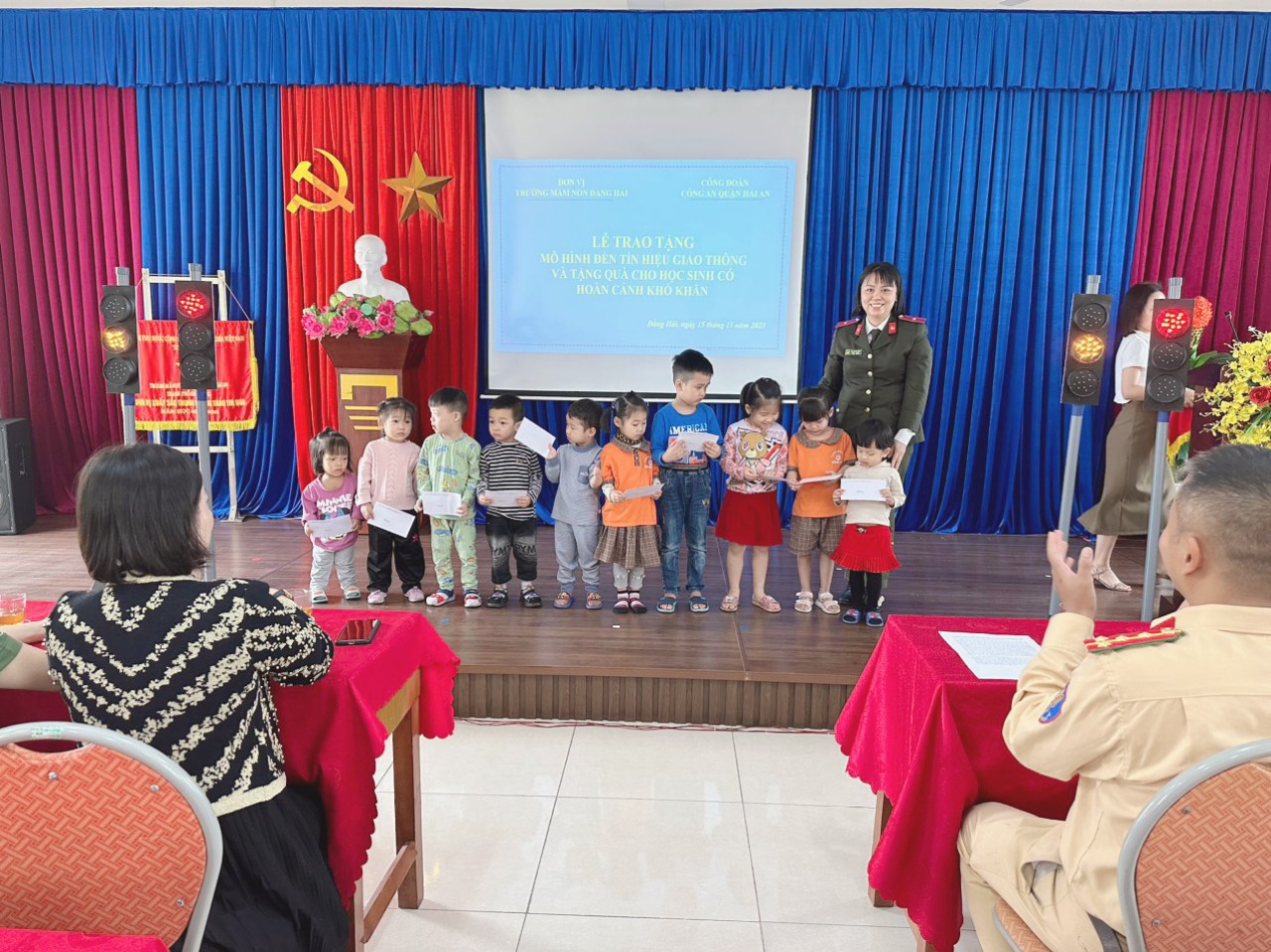 Sáng ngày 15/11/2023, tại Hội trường Khu B trường mầm non Đằng Hải. Công đoàn công an quận Hải an trao tặng mô hình đèn tín giao thông và 10 suất quà cho học sinh có hoàn cảnh khó khăn, học sinh khuyết tật nhà trường.