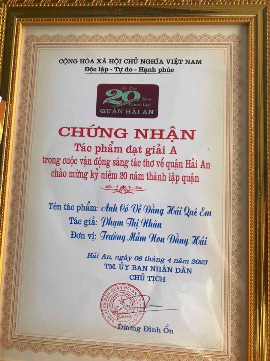 Hưởng ứng cuộc phát động sáng tác thơ và ca khúc về quận Hải An chào mừng kỉ niệm 20 năm thành lập quận (10/5/2003- 10/5/2023) các đồng chí Cán bộ, giáo viên, nhân viên trường mầm non Đằng Hải tích cực tham gia. Kết quả rất vinh dự: