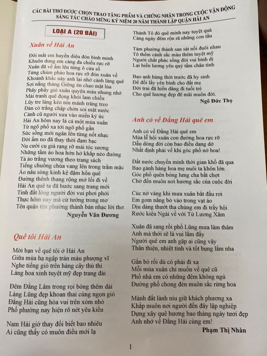 Tác phẩm thơ “Anh có về Đằng Hải quê em" của đồng chí Phạm Thị Nhàn đạt giải A. Một lần nữa xin chúc mừng đồng chí;