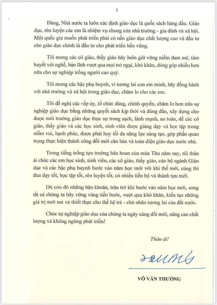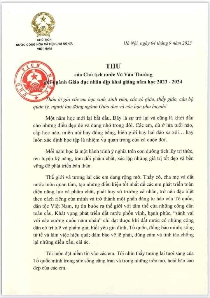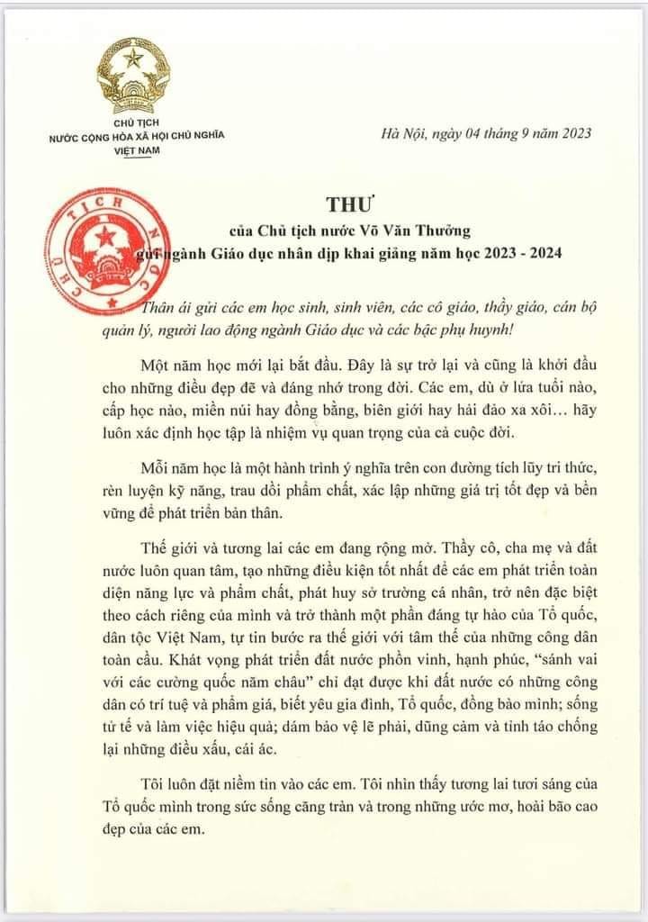 Trước thềm năm học mới, hòa chung không khí vui tươi, phấn khởi của "Ngày hội toàn dân đưa trẻ đến trường Bác Võ Văn Thưởng - Chủ tịch nước đã rất quan tâm gửi thư chúc mừng, động viên các bé, thầy cô giáo và các bậc phụ huynh nhân dịp năm học mới.