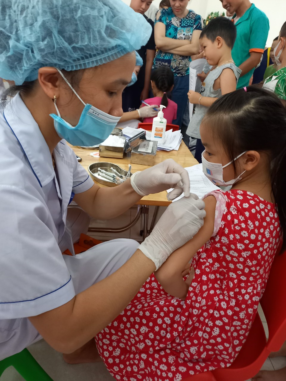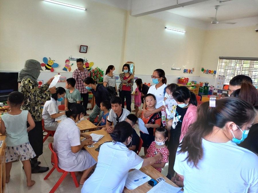 - Phụ huynh đã đưa trẻ đến điểm tiêm đúng thời gian thông báo. Trong quá trình tiêm các bé được các cán bộ y tế khám sàng lọc, chăm sóc các bé chu đáo sau khi tiêm xong.