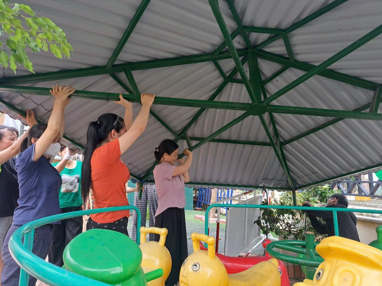 Tập thể CBGVNV đã tích cực để nhanh chóng khắc phục các khu vực bị ảnh hưởng, đảm bảo môi trường học tập và vui chơi của các bé được phục hồi tốt nhất.