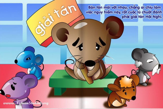 Một con chuột đứng dậy và nói: “Tôi có kế hoạch này, nếu chúng ta đeo một cái chuông vào cổ của con mèo thì mọi cử động của nó, chúng ta đều biết được”. Đây cũng là một ý kiến hay, thế nhưng vấn đề được đặt ra là ai sẽ làm điều đó. Và khi câu hỏi này được nêu lên, không một ai đáp lại.